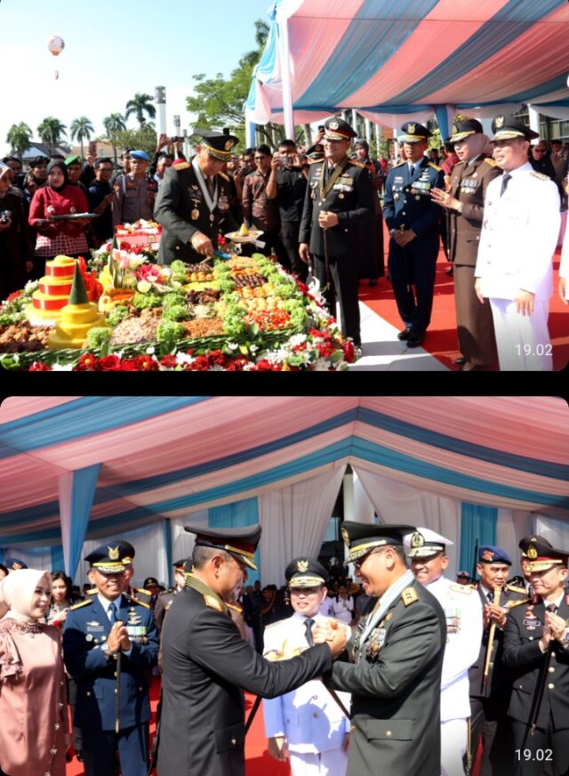 PONTIANAK – REPUBLIKA TIMES – Pangdam XII/Tanjungpura Mayjen TNI Jamallulael, S.Sos., M.Si., memberi kejutan kepada Kapolda Kalimantan Barat, Irjen Pol Pipit Rismanto, S.I.K., M.H., pada Hari Bhayangkara ke-79 di Kantor Gubernur Kalimantan Barat, Jalan Ahmad Yani, Kota Pontianak, Selasa (1/7/2025).