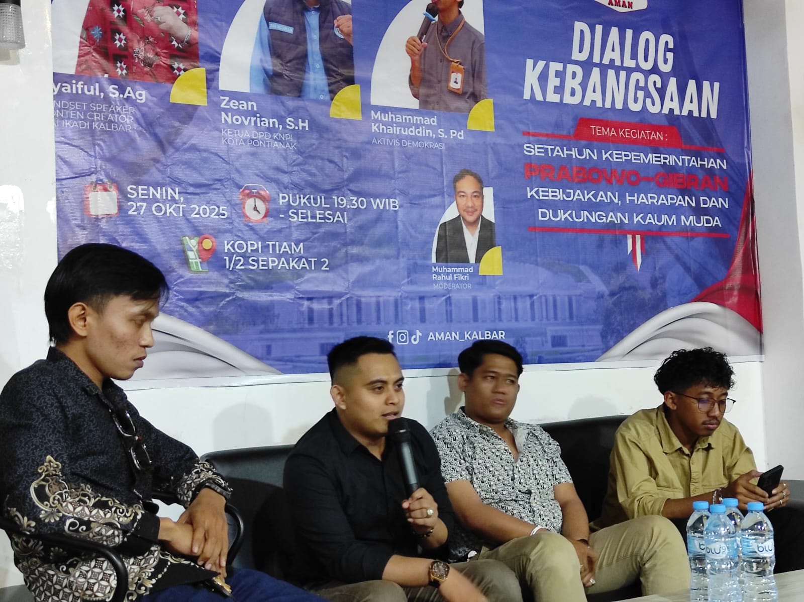 Diskusi menghadirkan 3 narasumber utama, yakni Zean Novrian (Ketua DPD KNPI Kota Pontianak), Muhammad Khairuddin (Aktivis Demokrasu) dan Syaiful ( Dai IKADI Kalimantan Barat) Ketiganya memberikan pandangan yang konstruktif terhadap capaian dan tantangan pemerintahan Prabowo–Gibran dalam satu tahun masa kerjanya.