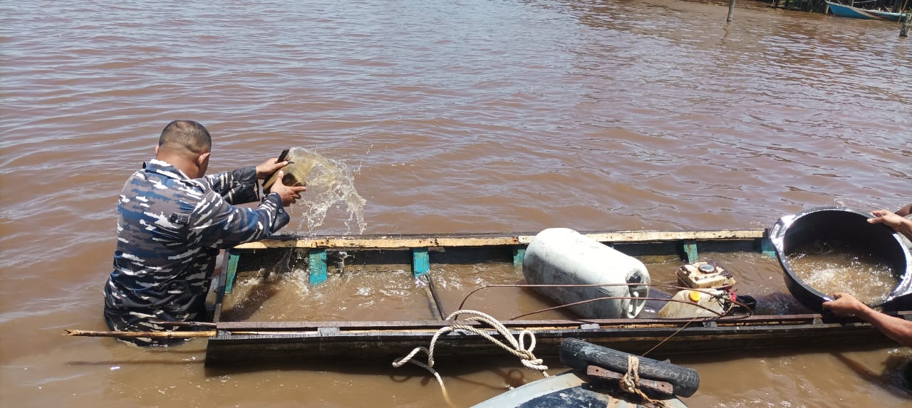 Kuburaya, REPUBLIKA TIMES – TNI AL, Kodaeral XII – Personel Pos Angkatan Laut (Posal) Sungai Kakap Kodaeral XII bersama masyarakat setempat melakukan evakuasi terhadap perahu nelayan yang tenggelam di perairan muara Sungai Kakap, Kabupaten Kuburaya, pada Jumat (19/9).