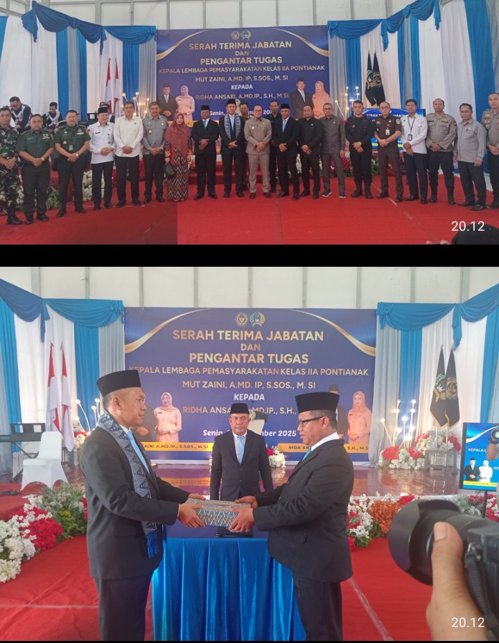 KUBU RAYA – REPUBLIKA TIMES – Serah terima jabatan (Sertijab) dan Pengantar Tugas Kepala Lembaga Pemasyarakatan (Lapas) Kelas IIA Pontianak dari Mut Zaini, A. Md.IP, S.Sos, M.Si kepada Ridha Ansari, A.Md.IP, S.H, M.Si., dilaksanakan di Aula Lapas Kelas IIA Pontianak, Senin (29/9).