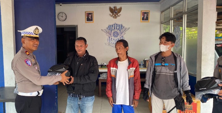 Wujud Kepedulian, Polantas Sekadau Bagikan Helm Gratis kepada Tukang Ojek